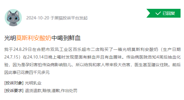 近来,安徽合肥的刘女士称在双凤工业区百乐超市二店购买了一箱光亮莫斯利安酸奶,出产日期为2024年7月15日,10月14日晚上喝时发现里边有疑似鲜血并且有血腥味,并于10月20日在投诉反应渠道进行投诉。