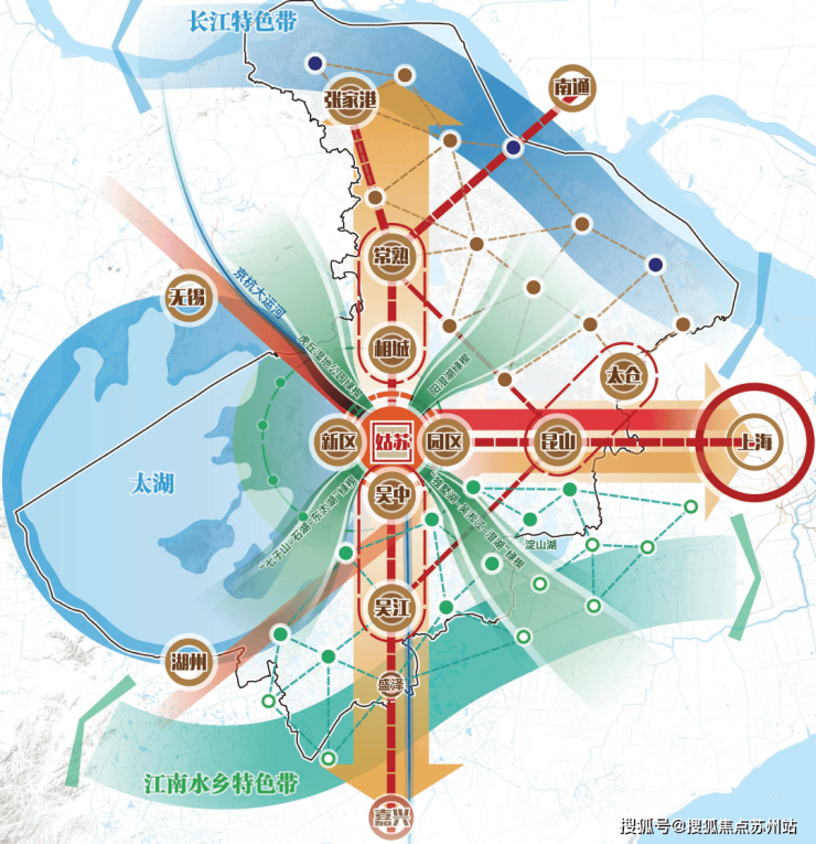 回顾苏州过去20年的发展,主要依托东西向的沪宁发展轴作为城市主动脉。然而,随着城市的不断扩张,东西向的沪宁发展轴已经趋于饱和,苏州的发展重心正在向南北向的通苏嘉甬发展轴转移,以寻求新的发展空间。而溪前雅居,正好位于这条新的城市发展轴上。